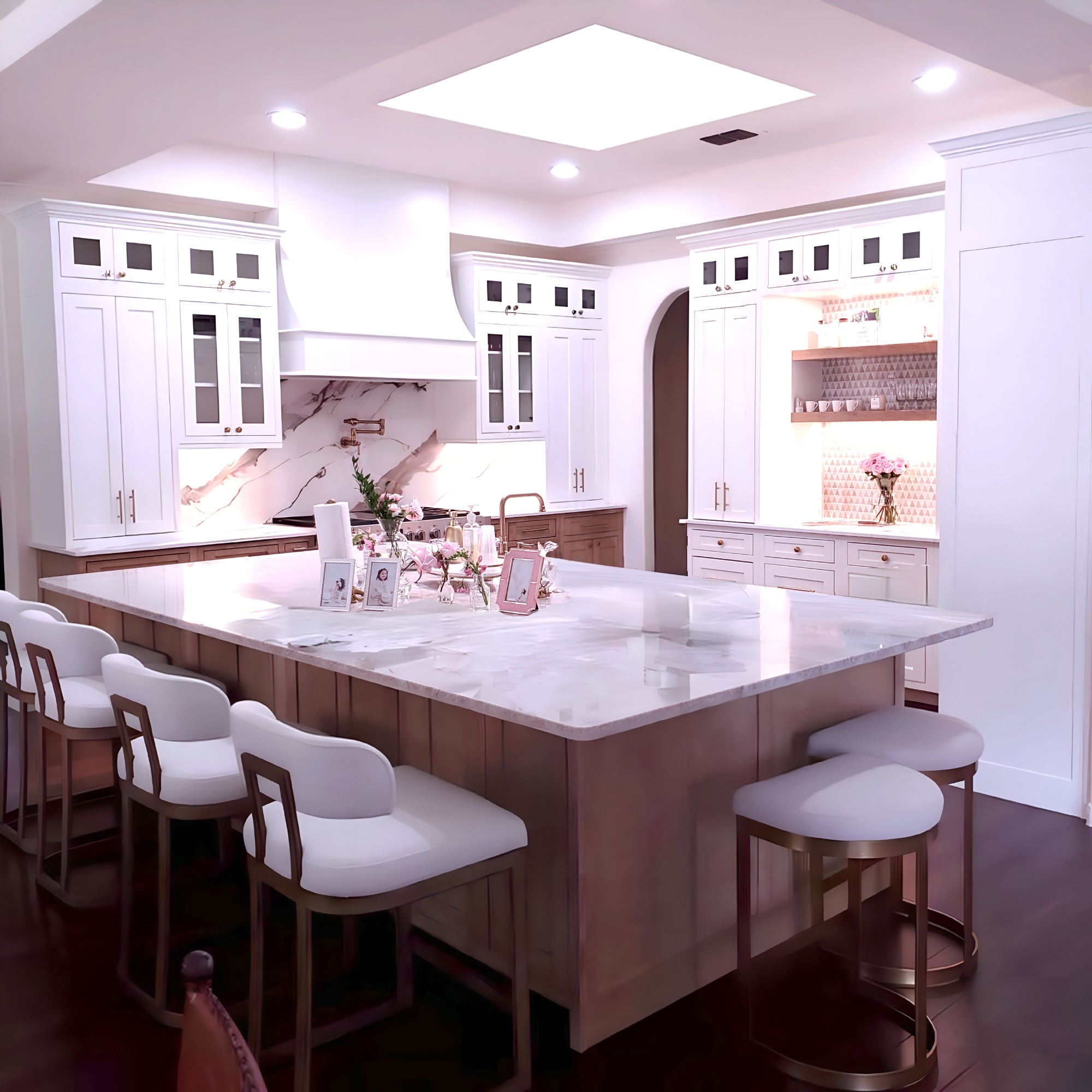 Material: Painted cabinetry with dark island cabinetry and glass display cabinets