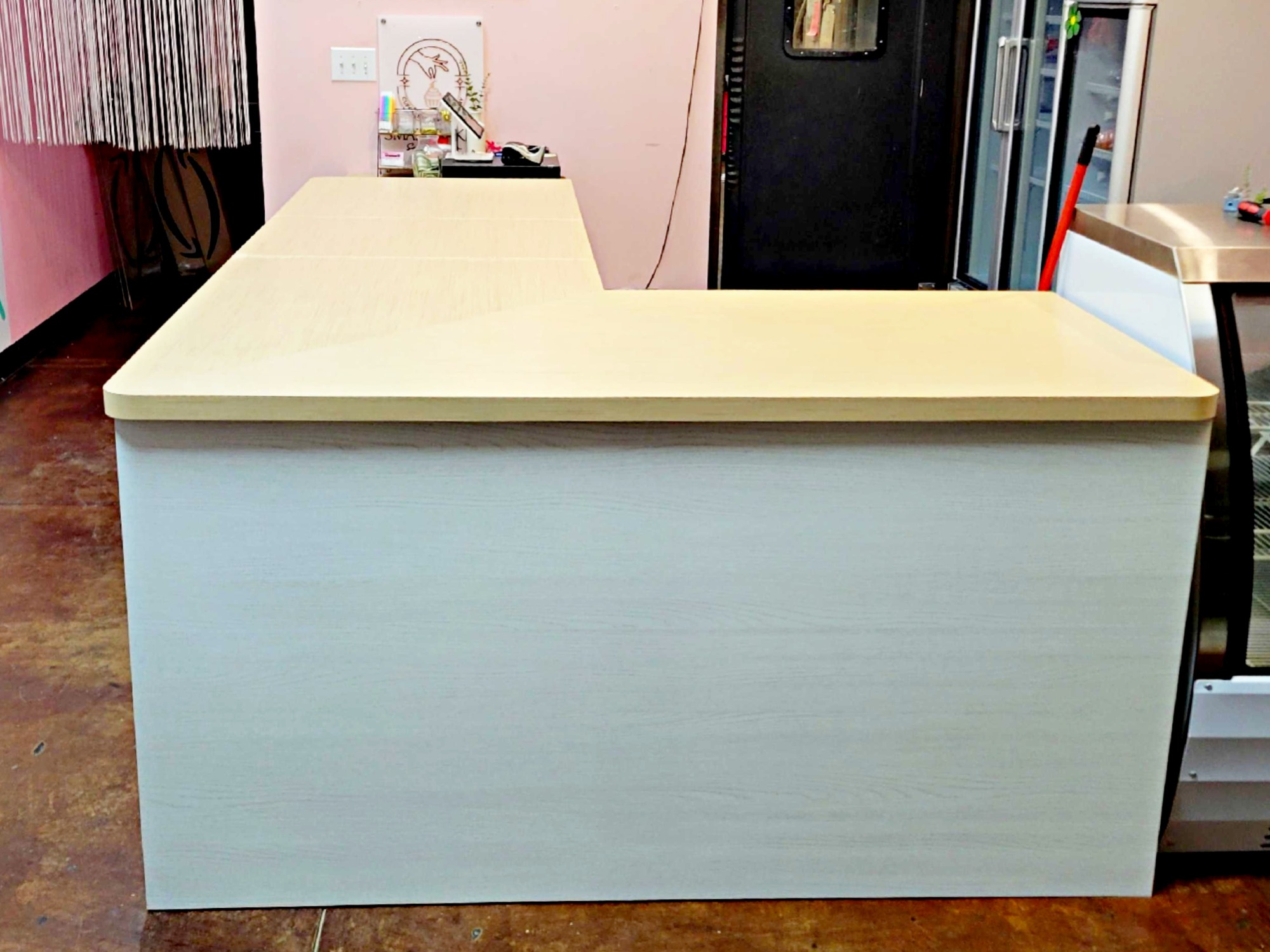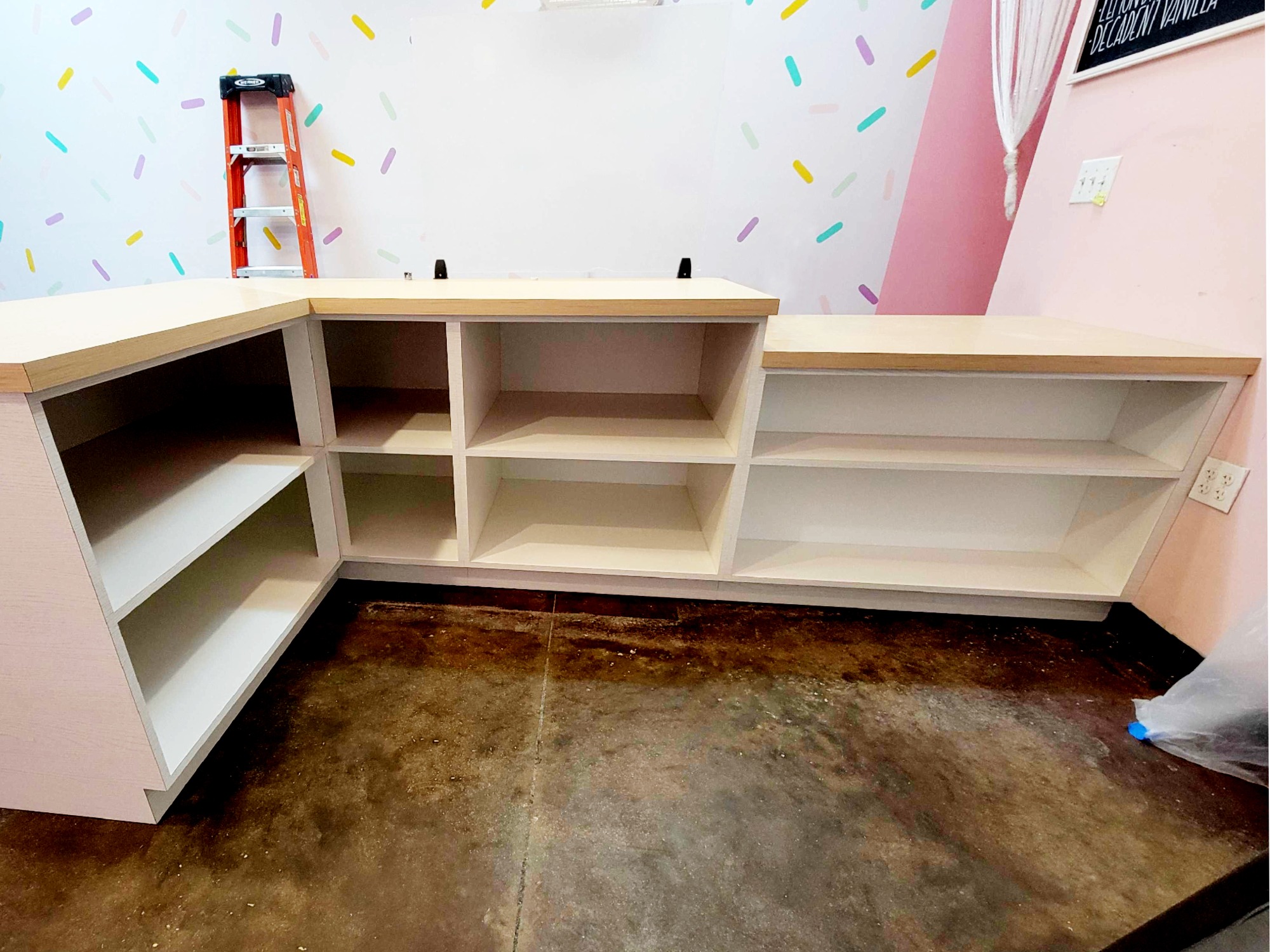 Scope: Commerical service counter and storage cabinetry installation including L shaped service counter and integrated storage shelving