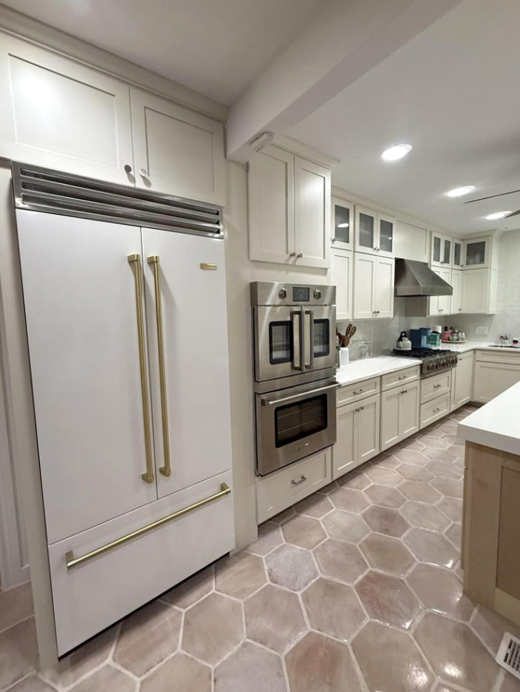 Material: Painted cabinetry with natural wood island